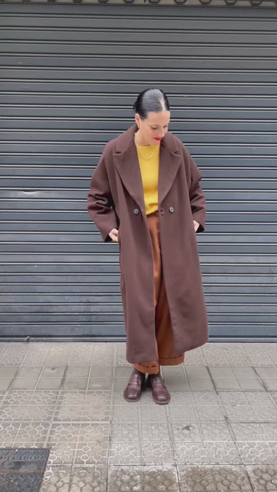 Abrigo largo de corte oversize en tono marrón chocolate, con solapa amplia y doble botonadura discreta. El tejido es grueso y suave, ideal para aportar calidez en los días fríos de otoño e invierno. Su diseño limpio y minimalista le da un aire sofisticado, sin perder comodidad. Perfecto para llevar sobre camisas, jerséis de punto o pantalones rectos, como en la imagen. Combina muy bien con tonos neutros, beige o crema, y también con accesorios en cuero o lana para un look elegante y sereno.