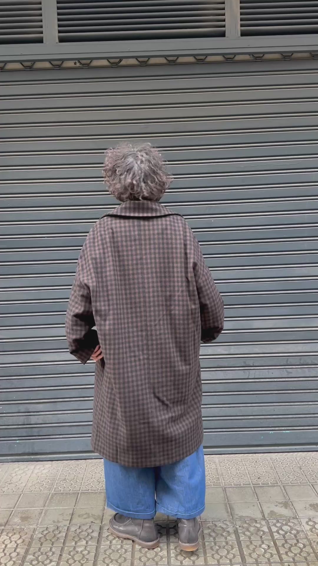 Abrigo largo de corte relajado con estampado de cuadros pequeños en tonos oscuros, perfecto para el otoño. Con solapa amplia, botones delanteros y líneas rectas, tiene un estilo clásico pero desenfadado que aporta calidez sin perder elegancia. El tejido parece suave y estructurado, ideal para superponer sobre jerséis de punto, pantalones anchos o vestidos midi. Funciona tanto en looks diarios como en combinaciones más cuidadas con botines o mocasines. Un básico atemporal para los días fríos.
