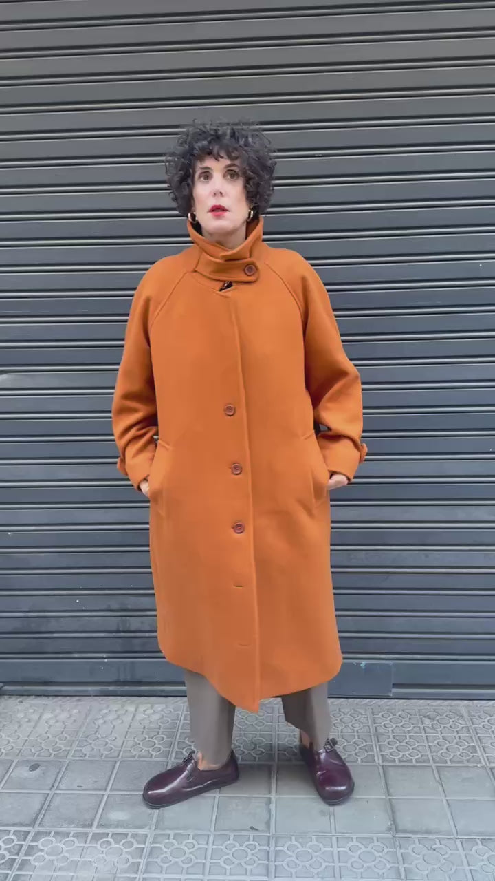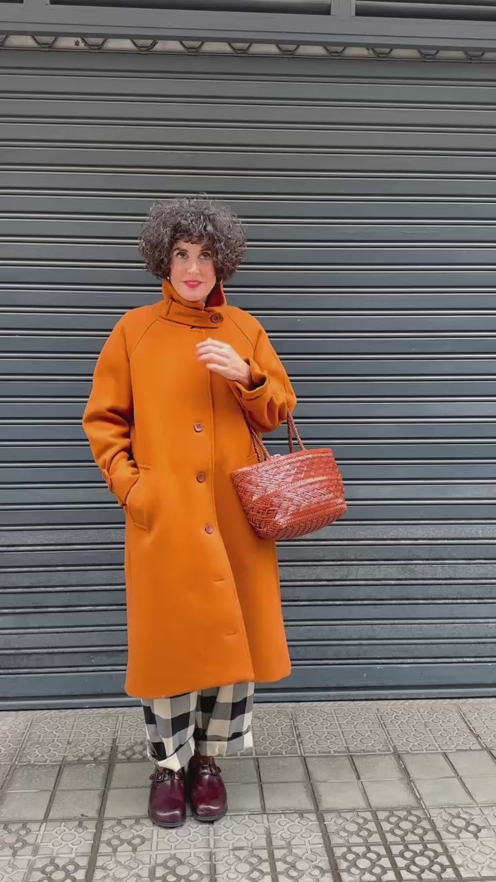 Abrigo largo en tono calabaza. Entre caldera, naranja quemafo y teja, con cuello alto cruzado y botonadura frontal. Suelto cuello solap. De lana gruesa y cálida, con un corte amplio y elegante. Perfecto para el otoño y el invierno, combina con pantalones rectos o vestidos y botas altas.