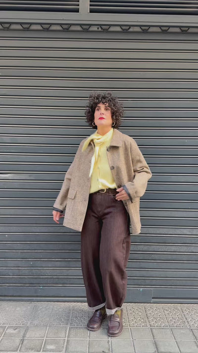 Chaqueta de lana mezcla en tono camel o marrón, con un corte recto y sencillo que la hace muy fácil de llevar en el otoño. El tejido tiene una textura suave y ligeramente jaspeada, que aporta calidez y un aspecto artesanal. Los bolsillos delanteros y los botones oscuros crean un bonito contraste y suman funcionalidad.