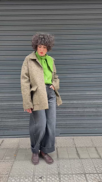 Chaqueta de lana gruesa en gris/verde jaspeado, con un corte recto y ligeramente amplio que le da un aire moderno y muy cómodo para el día a día. El tejido es cálido, consistente y perfecto para el otoño, con esa textura suave que invita a llevarla a todas partes.