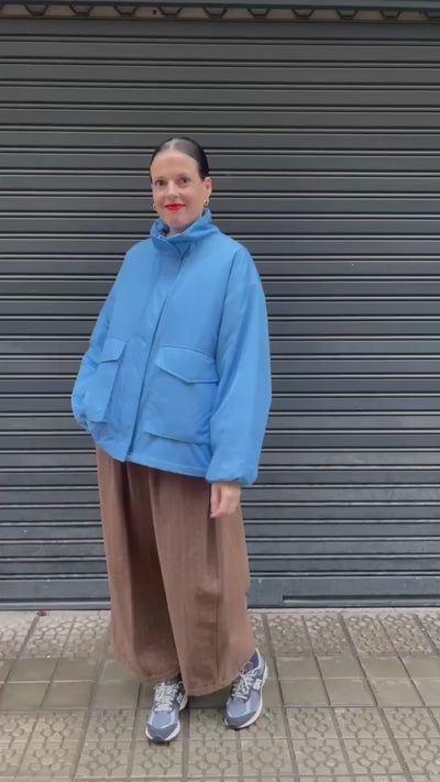 Cazadora bomber con cuello alto y cremallera frontal cubierta por una solapa con botones automáticos. Estilo oversize con hombros caídos y bolsillos de parche con solapa y botones automáticos. Relleno de plumón. Forro.