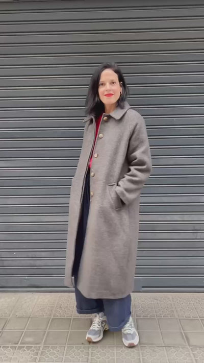 Abrigo largo en gris oscuro con un sutil patrón mini–pata de gallo que aporta textura sin recargar. Su corte amplio y relajado, con manga raglán y cuello clásico, le da un aire elegante pero muy fácil de llevar en el día a día. El tejido es cálido y con cuerpo, perfecto para acompañarte durante todo el otoño.