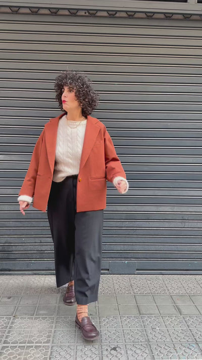 Americana de corte recto en tono teja, confeccionada en un tejido estructurado con ligera textura. Su solapa clásica y cierre de un solo botón la hacen elegante y versátil, mientras que el forro interior aporta comodidad. Perfecta para los días de otoño, combina de maravilla con vaqueros para un look informal o con pantalón sastre y botines para un estilo más sofisticado.