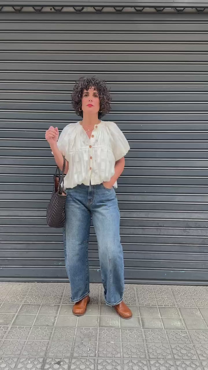 Blusa de silueta amplia y ligera, con cuello redondo fruncido y manga corta con volumen que aporta movimiento y un aire delicado. Confeccionada en un tejido semitransparente con textura de rayas sutiles, muy agradable y fresco para la temporada de primavera-verano. Su tono crudo ilumina el rostro y combina fácilmente con pantalones en beige, azul o tonos tierra. Ideal para un look suave, femenino y cómodo en los días más cálidos.