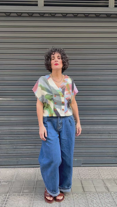 Blusa corta de inspiración cruzada, con escote en pico y botonadura doble que le da un aire muy especial. El tejido es fluido y ligero, con un estampado tipo pincelada en tonos verdes, azul empolvado, teja y crema que recuerda a una pintura abstracta. Las mangas amplias equilibran el volumen y aportan movimiento. Ideal para otoño, queda preciosa con pantalones lisos en crudo, verde oliva o vaquero, dejando que el estampado sea el protagonista del conjunto.