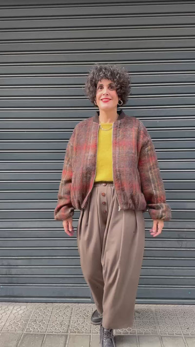 Cazadora tipo bomber de cuadros en tonos marrones con toques rojizos y anaranjados. Su tejido cálido y suave la hace perfecta para los días frescos de otoño, aportando color y textura a cualquier look. Queda ideal con vaqueros o pantalones de pana y un jersey de punto fino debajo.