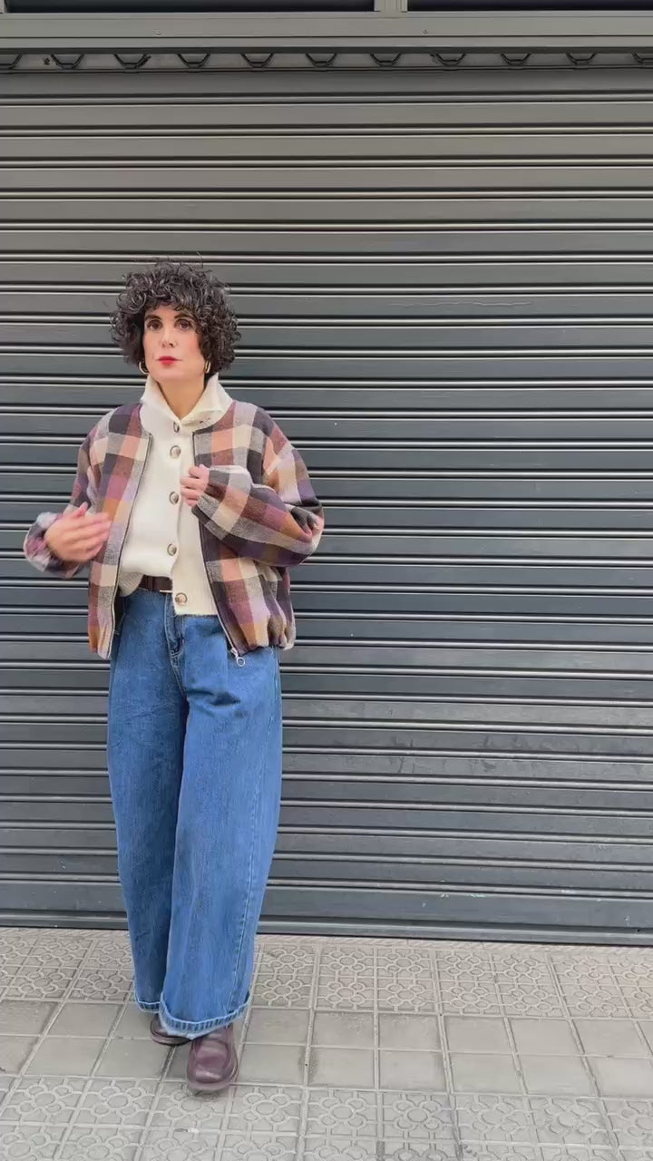 Chaqueta de cuadros en tonos otoñales con tejido suave de efecto franela. De corte relajado, cuello redondo y cierre de cremallera frontal, cuenta con bolsillos y bajo con goma fruncida que le da un aire casual y cómodo. Aporta color y calidez a los looks de entretiempo, combinando especialmente bien con prendas en tonos tierra, crema o denim.