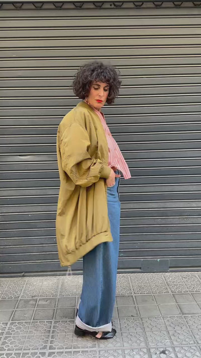 Chaqueta ligera de inspiración bomber con silueta amplia y relajada. Presenta cierre frontal con cremallera, puños y bajo elásticos y bolsillos delanteros que aportan un aire práctico. Confeccionada en un tejido ligero de tono verde oliva, con una textura suave que la hace muy cómoda. Ideal para primavera, perfecta para llevar sobre vestidos o conjuntos ligeros y dar un toque desenfadado al look.