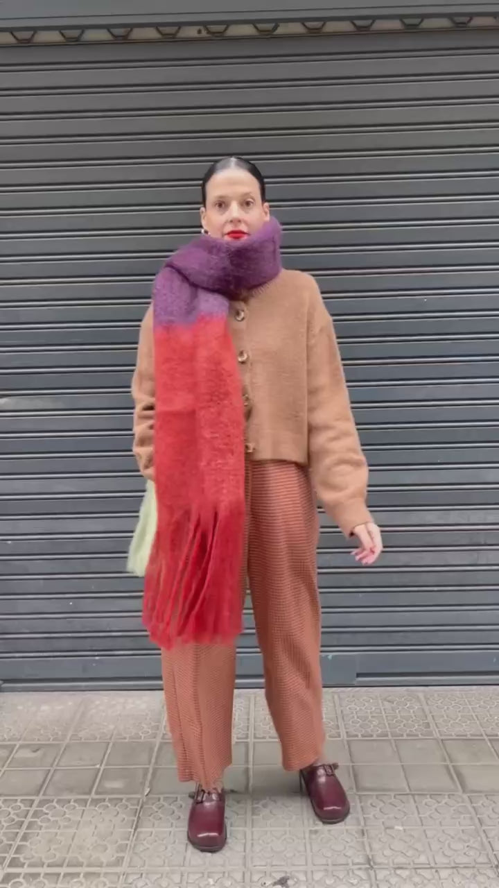 Bufanda larga en tres bloques de color —ciruela profundo, rojo teja y un verde muy suave— confeccionada en un punto esponjoso tipo mohair que aporta mucha calidez y una textura mullida, perfecta para el otoño. La combinación de tonos es vibrante pero equilibrada, y los flecos largos añaden movimiento y un acabado artesanal.