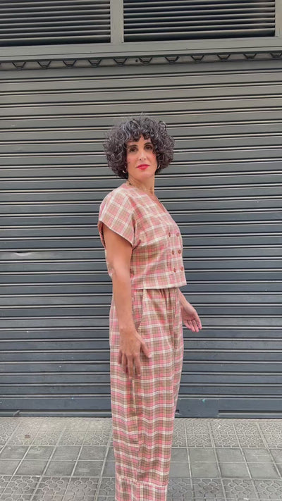 Blusa corta de cuadros en tonos rosa empolvado, beige y marrón, con diseño cruzado y doble botonadura frontal. La forma es amplia y ligeramente evasé, con hombro caído y manga corta tipo murciélago que aporta movimiento y un aire relajado. El tejido es ligero y suave, con una caída fluida y una textura agradable al tacto. Los botones en tono madera refuerzan su carácter cálido y natural. Ideal para combinar con pantalones de tiro alto o faldas sencillas, funciona muy bien tanto sola como con una capa ligera en los días de entretiempo, perfecta para el inicio del otoño.