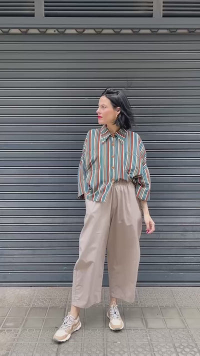 Blusa fluida de corte recto, con cuello camisero suave y cierre frontal con botones en tono madera que aportan calidez. El tejido es ligero y con buena caída, agradable al tacto y muy cómoda para el día a día. Estampado de rayas verticales en tonos verde azulado, crudo y terracota, que estiliza y le da un aire retro muy actual. Mangas largas con volumen sutil y bajo ligeramente suelto. Perfecta para ya queda ideal con vaqueros, pantalones lisos en tonos tierra o faldas midi para un look relajado pero con carácter.