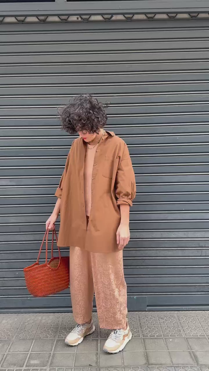 Camisa con hombro caído y manga larga que puede llevarse remangada. Confeccionada en un tejido ligero, muy agradable al tacto y con una caída natural. El color teja, cálido y atemporal, aporta profundidad y combina fácilmente con tonos crudos, beige, verdes o denim.