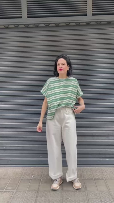 Camiseta de silueta suelta y hombro caído, con cuello redondo y manga corta amplia que aporta un aire relajado y cómodo. Confeccionada en algodón suave, con buena caída y tacto agradable. El juego de rayas en verde y crudo le da un punto fresco y atemporal.