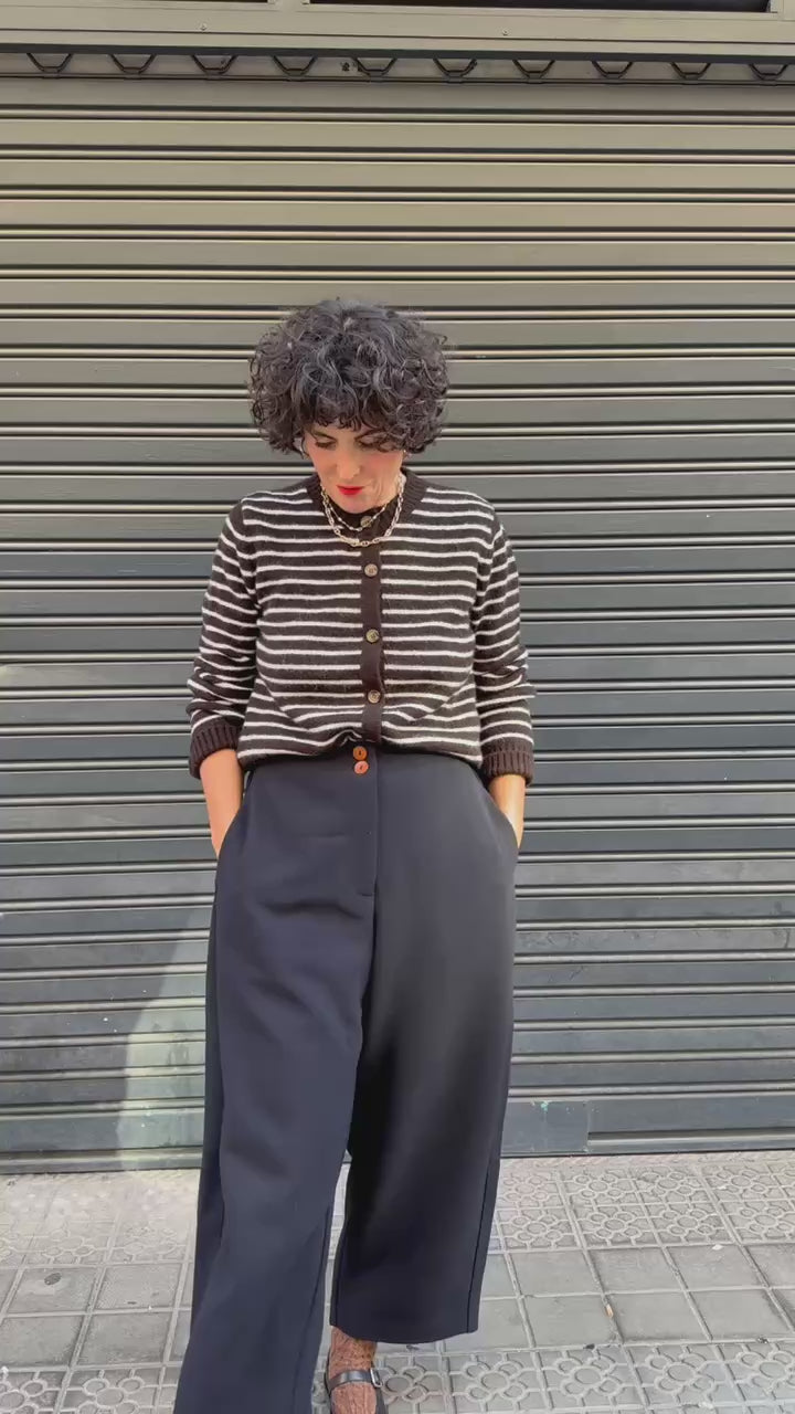 Chaqueta de punto en marrón oscuro con rayas blancas, de textura suave y cálida ideal para el otoño. Con corte recto, cuello en pico y cierre de botones delanteros, es una prenda versátil y favorecedora. Los acabados en canalé en bajo y puños aportan un toque estructurado. Perfecta para combinar con vaqueros en un look casual o con pantalones de vestir para un aire más elegante.