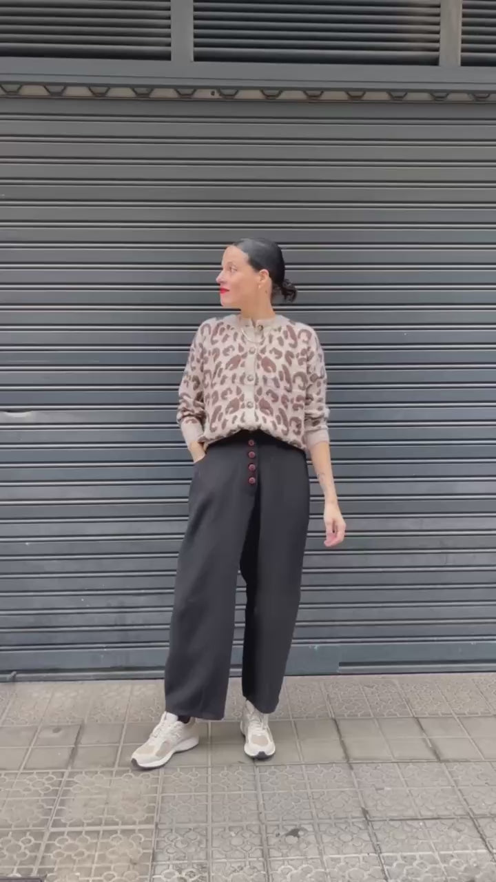 Cárdigan de punto suave con estampado de leopardo en tonos beige y marrón. Su corte relajado y los botones delanteros lo hacen cómodo y versátil, ideal para los días de otoño. Perfecto para combinar con vaqueros o pantalones de pana y añadir un toque cálido y desenfadado al look.