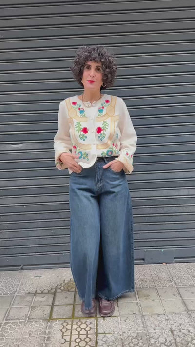 Destacan los bordados florales multicolor en delantero y mangas, que aportan un aire artesanal y delicado sin recargar. Fácil de combinar con vaqueros, faldas fluidas o sobre vestidos sencillos. Una prenda especial pero muy ponible, ideal para dar un punto distinto a los looks de la temporada.
