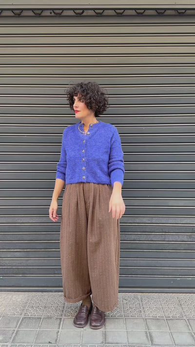 Cárdigan de punto esponjoso en azul añil, con un corte recto y botones al tono que le dan un acabado limpio y muy versátil. Su textura suave y cálida lo convierte en una prenda perfecta para los días frescos de otoño, aportando confort sin perder ligereza.