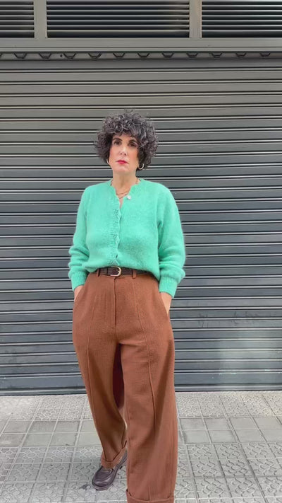 Chaqueta de punto con botones y escote redondeado, en un bonito tono verde jade que aporta frescura y color. Su textura es suave y ligeramente esponjosa, con ese tacto cálido y ligero que la hace perfecta para el otoño. De corte recto y mangas amplias, resulta fácil de combinar con vaqueros, faldas o pantalones de pana. Una prenda alegre y confortable que ilumina los días más grises de la temporada.