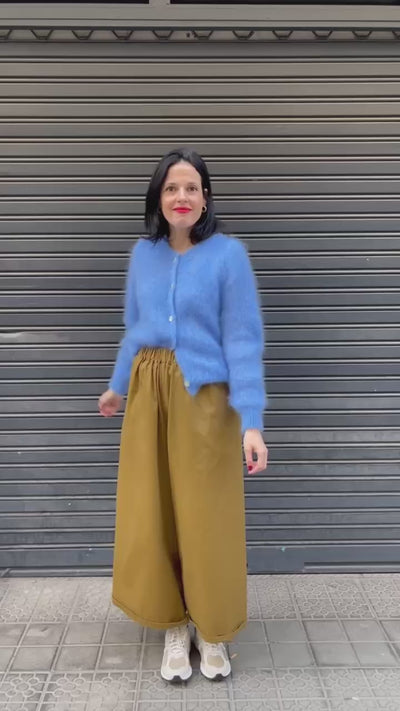 Cárdigan de punto suave en tono azul luminoso, con escote en pico y cierre frontal de botones. La silueta es recta y ligeramente corta, con manga larga y puños ajustados que aportan comodidad y una caída natural. El tejido es mullido y ligero, muy agradable al tacto. Fácil de combinar con vaqueros, blancos, grises o tonos tierra, es una prenda perfecta para dar color y calidez a los looks de otoño.