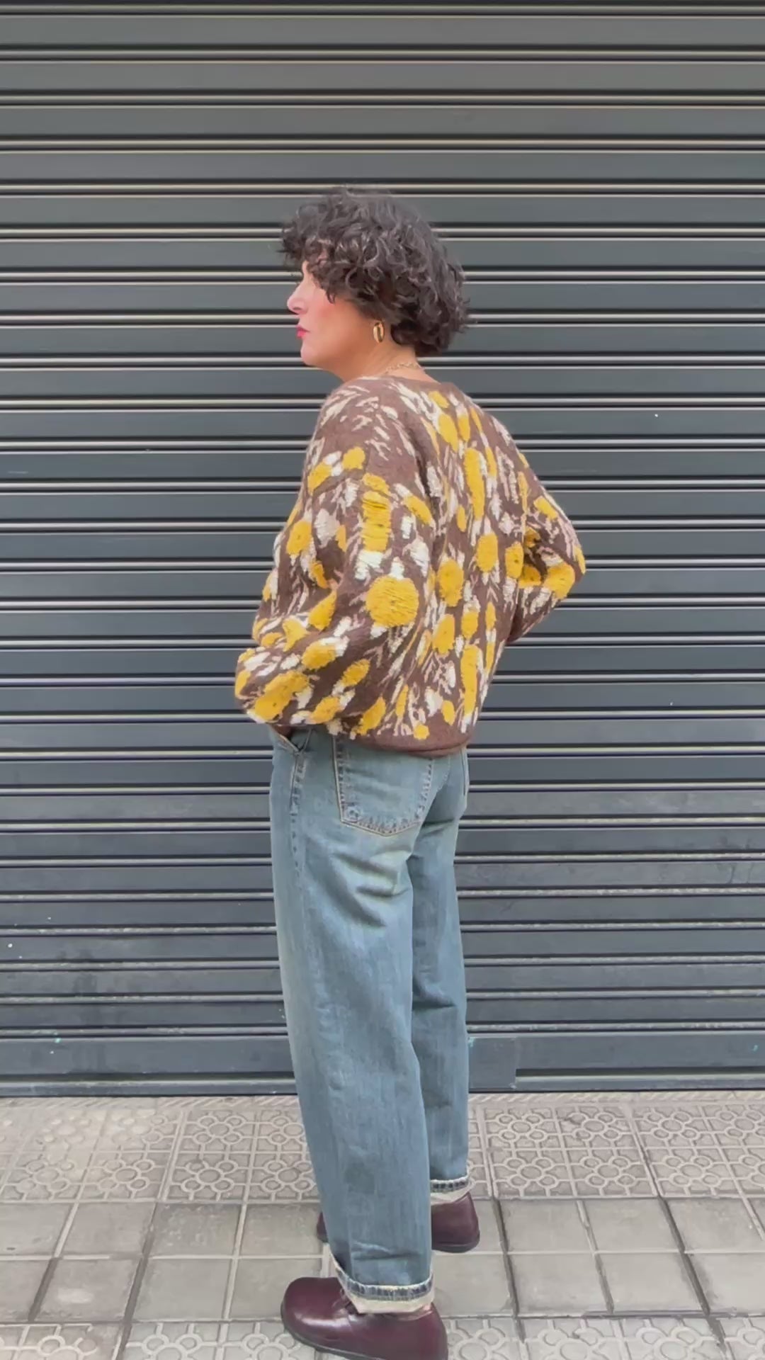 Cárdigan de punto grueso con estampado floral en tonos marrones, amarillos y crudos. De aire vintage y textura mullida, aporta calidez y personalidad a los looks de otoño. Perfecto para combinar con denim o faldas lisas, dando un toque alegre y artesanal a los días fríos.