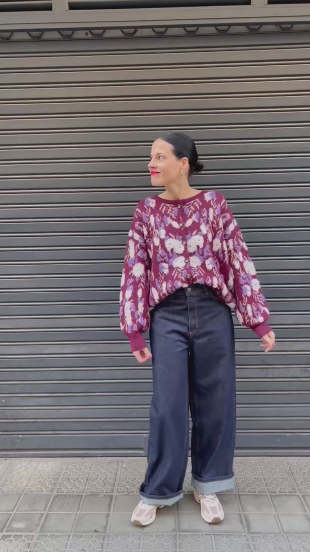 Cárdigan de punto con un estampado floral en tonos borgoña, crudo y malva, muy cálido y con ese toque artesanal que hace especial cualquier look otoñal. El tejido es esponjoso y suave, con una caída cómoda y un punto grueso que abriga sin resultar pesado.