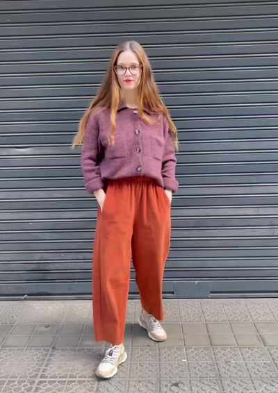 Chaqueta de punto con cuello camisero y botones delanteros, en un tono burdeos suave que recuerda al vino tinto. Su textura es mullida y ligeramente afelpada, muy agradable al tacto y perfecta para las primeras capas del otoño. El corte recto y las mangas remangadas le dan un aire desenfadado y fácil de combinar, tanto con vaqueros como sobre vestidos. Una prenda cálida y versátil que aporta color y suavidad a los días frescos.
