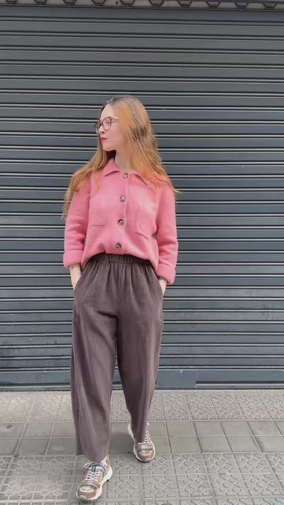 Chaqueta corta de punto con cuello camisero y cierre de botones, en un tono rosa empolvado que aporta luz y suavidad. Su textura es mullida y ligeramente peluda, muy agradable al tacto, perfecta para los días frescos de otoño. El corte recto y los bolsillos frontales le dan un aire relajado y fácil de combinar: queda ideal con vaqueros, pantalones de lana o sobre vestidos ligeros. Una prenda cálida y femenina que invita a abrigarse con estilo.