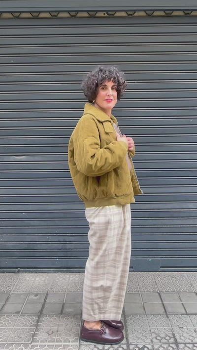Chaqueta de pana en tono mostaza, de corte ligeramente oversize con cremallera frontal. Tiene cuello amplio, bolsillos laterales y puños y bajo elásticos que aportan calidez y un aire retro muy otoñal. El tejido de pana gruesa la convierte en una prenda perfecta para los días frescos, ideal para un estilo casual y acogedor. Un básico con carácter para el armario de temporada.