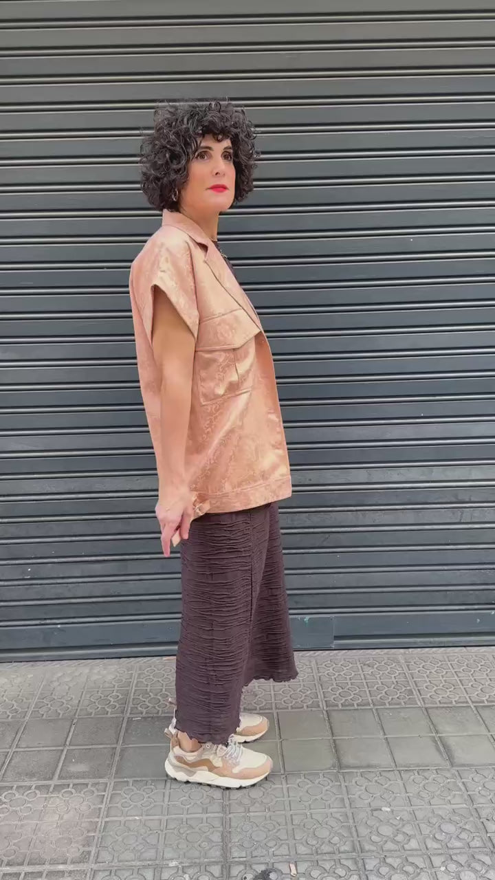Chaleco ligero de inspiración sastre, con cuello de solapa y cierre frontal de botones. Confeccionado en un tejido con sutil relieve floral tono sobre tono, en un beige rosado muy suave que aporta luz y delicadeza. Presenta bolsillos frontales tipo parche con tapeta y detalle ajustable en el bajo para regular la silueta. Una prenda especial para la primavera , perfecta sobre camisas blancas o de algodón fino..