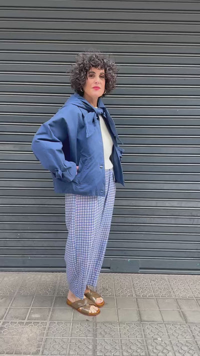Chaqueta en tono azul marino, con lazada envolvente en el cuello. Con gorro extraible.