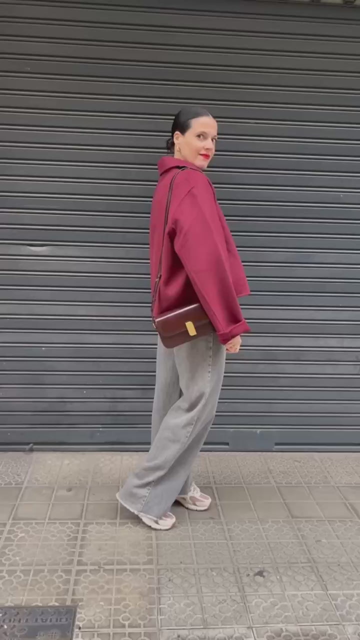 Chaqueta de lana hilada de doble cara. Cuello amplio con solapa y mangas raglán largas con puños acampanados y botones ajustables. Bolsillos laterales insertados. Cierre frontal con cremallera y solapa con broches a presión.