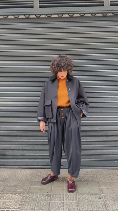 Chaqueta corta en color azul oscuro con cuello de pana al tono, confeccionada en un tejido estructurado y cálido. Presenta cierre frontal con botones, amplios bolsillos con solapa y bajo ligeramente fruncido que aporta volumen y un ajuste favorecedor. Las mangas largas permiten llevar el puño doblado, mostrando un detalle acolchado interior. Una prenda elegante y versátil, perfecta para combinar con pantalones anchos o vestidos midi, añadiendo un toque contemporáneo y sofisticado a los looks de otoño.