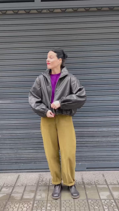 Chaqueta efecto piel en negro, con corte amplio y cuello alto que le da un aire moderno y muy versátil. El acabado ligeramente satinado aporta textura y un punto sofisticado, mientras que la cremallera frontal y los puños elásticos hacen que sea cómoda y práctica para el día a día.