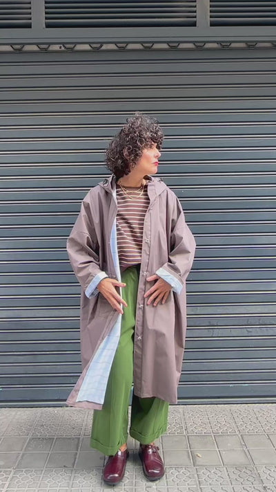 Capa impermeable en tono topo con capucha y corte amplio, ideal para los días de lluvia en otoño. Su diseño oversize aporta comodidad y un aire desenfadado, mientras que los botones al frente y los bolsillos laterales hacen que sea práctica y funcional. Perfecta para llevar sobre jerséis o chaquetas ligeras, asegurando estilo y protección en días grises.