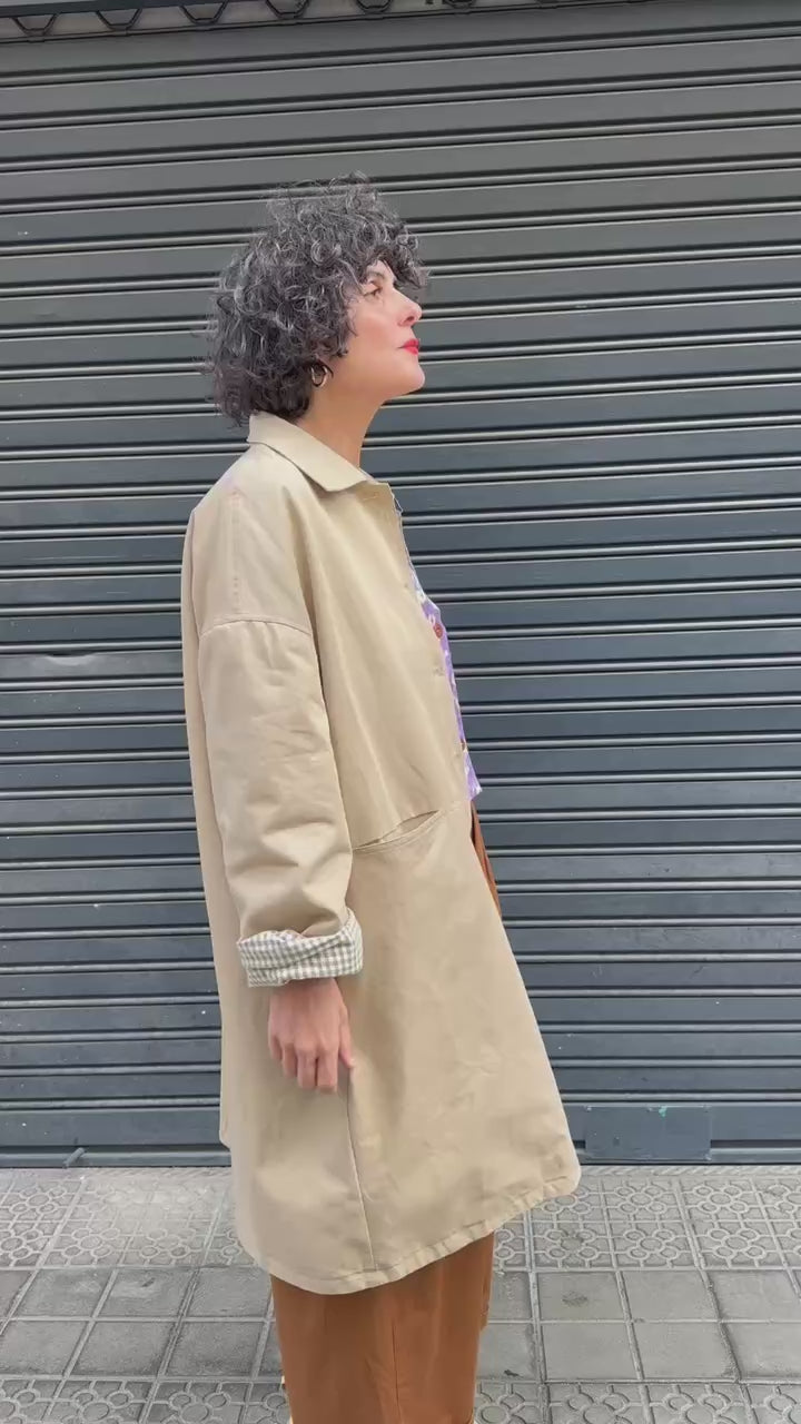 Es una prenda reversible, con un lado liso en beige y el otro con estampado de cuadro vichy, lo que permite dos looks en una sola pieza. Las mangas son largas y pueden remangarse para dejar ver el contraste del interior. Un abrigo versátil, práctico y muy fácil de combinar para la temporada.