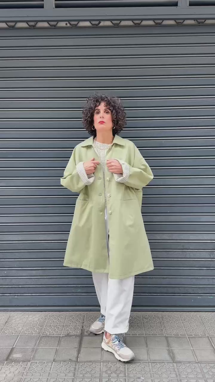 Gabardina ligera de silueta amplia y largo por encima de la rodilla, diseñada para llevar de forma relajada. Presenta cuello camisero, cierre frontal con botones y bolsillos amplios que aportan un aire práctico. Está confeccionada en un tejido ligero y reversible: por un lado en tono verde suave y por el otro con un delicado estampado de cuadros pequeños, lo que permite dos estilos diferentes en una sola prenda. Ideal para la temporada de primavera-verano, perfecta para acompañar vestidos, pantalones amplios o denim y añadir un toque especial y versátil al conjunto.