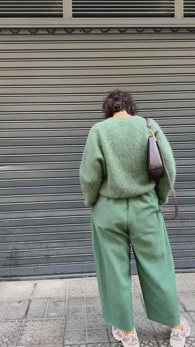 Jersey de punto en tono verde bosque, con textura suave y ligeramente esponjosa que aporta calidez. De corte recto y sencillo, cuenta con cuello redondo y mangas largas, ideal para el día a día en los meses fríos. Una prenda acogedora y versátil que combina fácilmente con vaqueros, pantalones de lana o faldas midi para un look cómodo y natural.