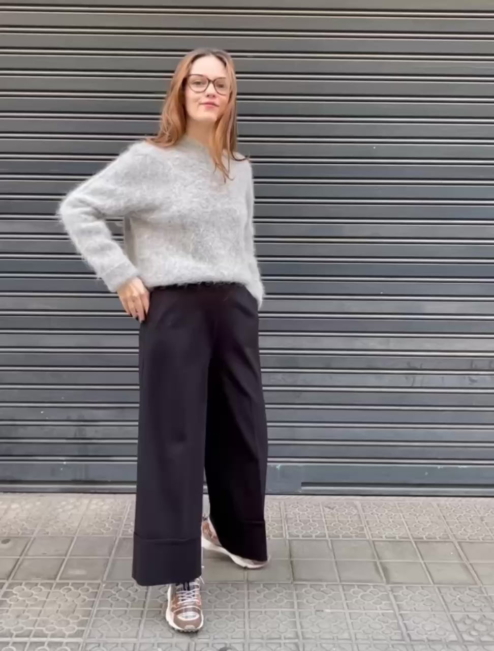 Suave jersey de punto de alpaca. Estilo de hombros caídos con ribetes de canalé en el cuello, los puños y el dobladill