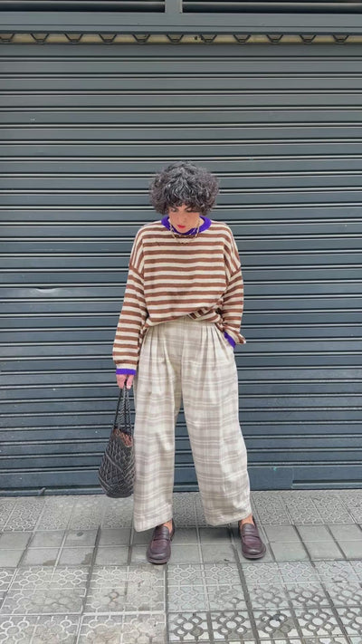 Jersey ligero de rayas en tonos tierra con un toque especial en los remates azul cobalto. Su tejido suave y el corte relajado lo hacen cómodo y fácil de llevar. Ideal para combinar con pantalones anchos o faldas midi, aportando color y calidez a los looks de otoño.
