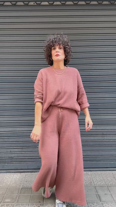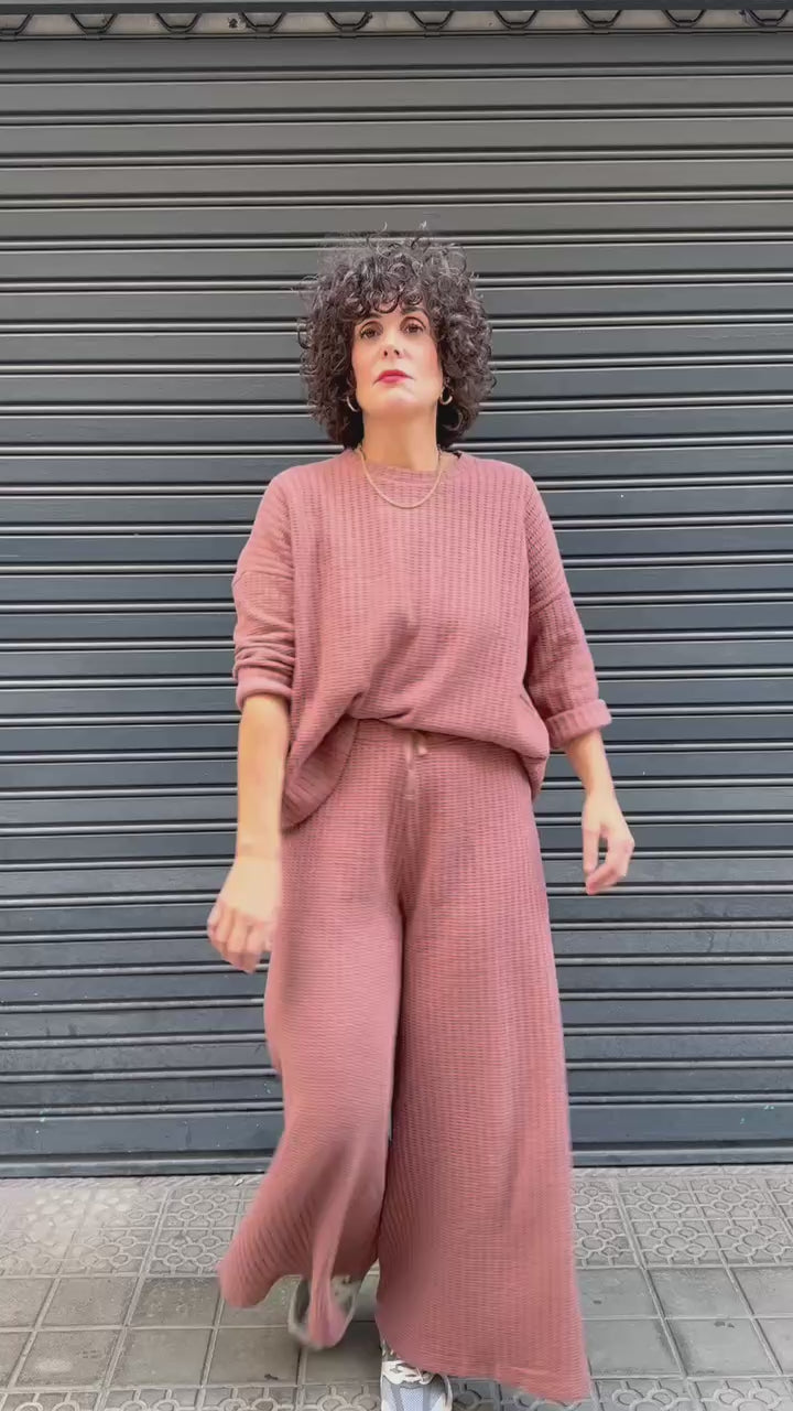 Camiseta de manga larga en tejido de canalé ancho, con una textura suave y ligeramente elástica que aporta comodidad y calidez. Su color teja apagado tiene ese tono otoñal que combina fácilmente con vaqueros, beige o verdes suaves. El corte recto y los puños vueltos le dan un aire desenfadado y natural, ideal para el día a día o para superponer bajo chaquetas de pana o punto grueso en los primeros días frescos de otoño.