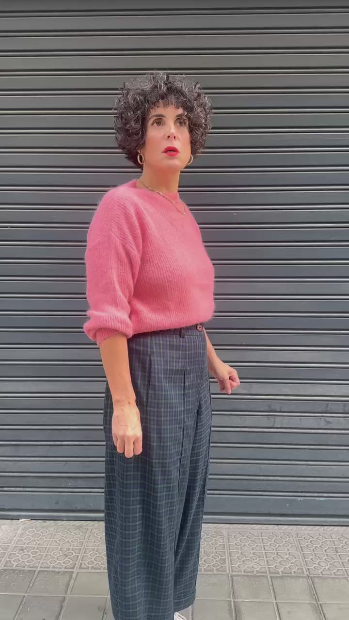 Jersey de punto suave en color rosa empolvado, con cuello amplio y mangas ligeramente caídas. De textura cálida y agradable, ideal para el otoño. Combina con pantalones amplios o faldas midi en tonos neutros o tierra.