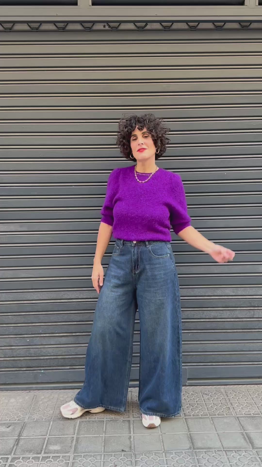 Jersey corto en un morado vibrante que aporta luz y alegría a los looks de otoño. Su tejido suave y esponjoso crea una textura cálida sin ser pesada, y las mangas abullonadas a media manga le dan un toque femenino y actual.