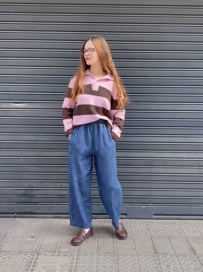 Jersey de punto con rayas anchas en rosa y marrón chocolate, cuello camisero y abertura con dos botones. Su textura es suave y agradable, con ese punto cálido y algo esponjoso que invita a llevarlo durante todo el otoño. El contraste de colores aporta un aire divertido y actual, mientras que el corte relajado lo hace muy cómodo. Perfecto con vaqueros o pantalones de pana para un look desenfadado y acogedor.