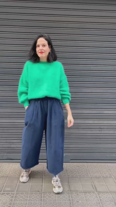 Jersey amplio de punto esponjoso en un vibrante tono verde esmeralda. Suave, ligero y muy agradable al tacto, con cuello redondo y manga caída. Perfecto para dar color a los días grises de otoño, combina bien con denim, faldas midi o pantalones de pana en tonos tierra.