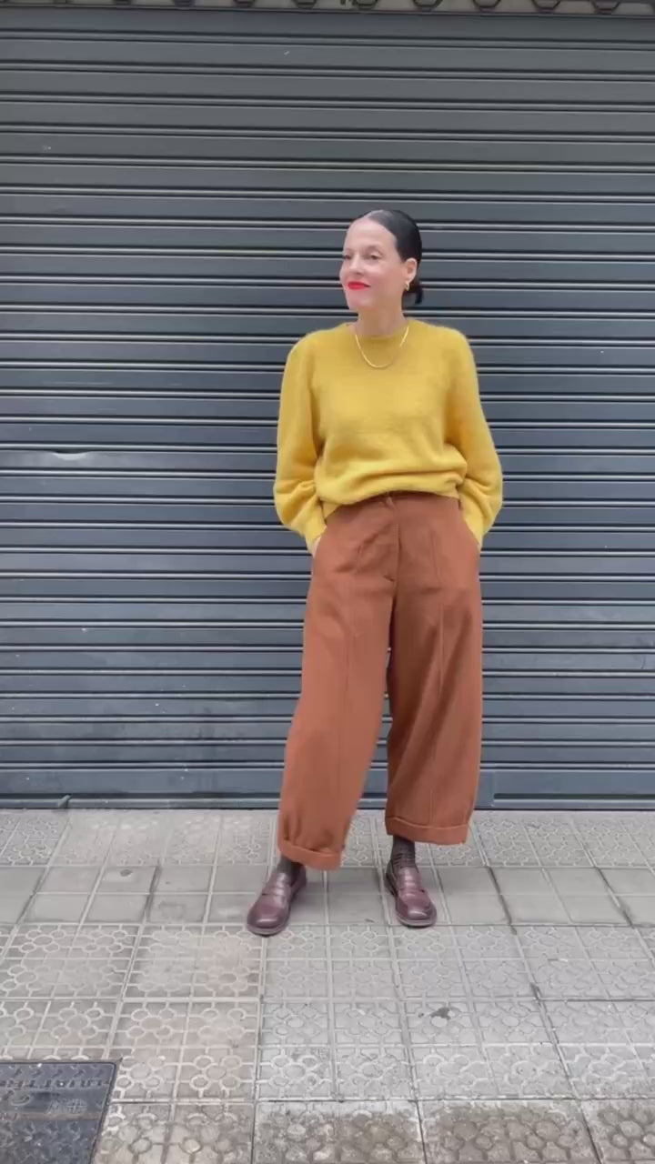 Jersey de punto suave en color mostaza, con ligero frunce en los hombros y acabado redondeado. Cálido y luminoso, es una prenda ideal para el otoño, fácil de combinar con pantalones de pana, faldas midi o vaqueros en tonos tierra o crudos.