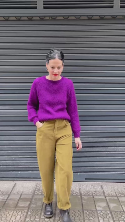 Jersey de punto suave en morado intenso, con un corte recto y un tejido esponjoso que aporta mucha calidez sin resultar pesado. Los acabados en canalé en cuello, puños y bajo mantienen un aire clásico y muy fácil de combinar, perfecto para los días fríos de otoño.