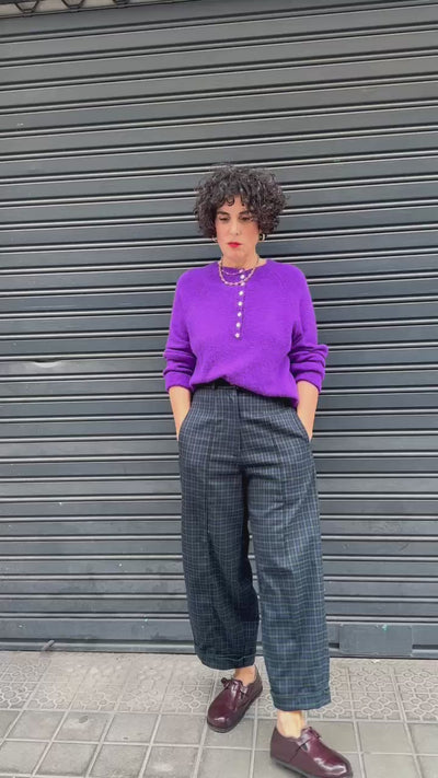 Jersey de punto suave en color violeta intenso, con media abotonadura delantera y mangas ligeramente abullonadas. Su textura cálida y su color vibrante lo hacen perfecto para iluminar los días grises del otoño. Ideal con vaqueros o pantalones de pana en tonos tierra.