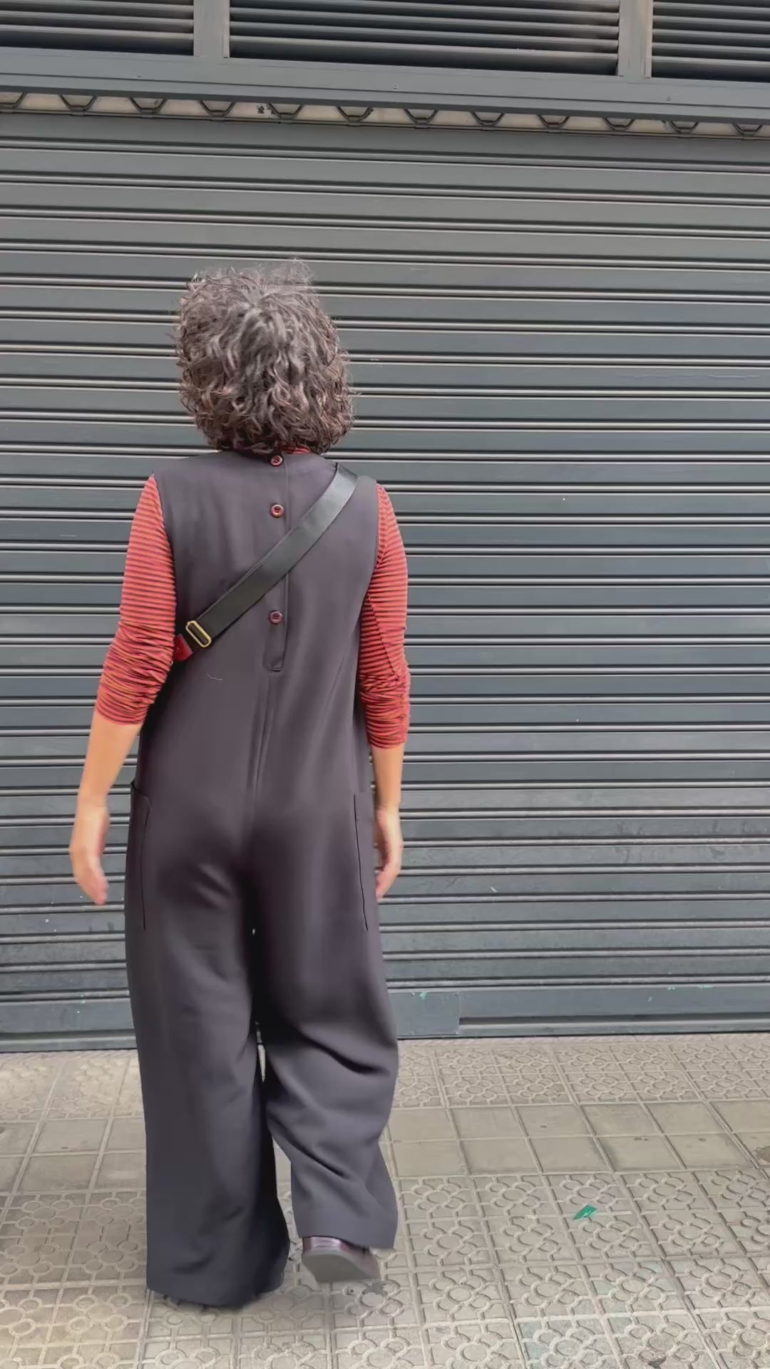 Mono largo en negro de líneas minimalistas, confeccionado en tejido fluido y elegante. Su escote en pico profundo al frente y los botones en la espalda lo hacen especial, mientras que los bolsillos delanteros aportan practicidad y comodidad. Una prenda versátil para otoño que puedes llevar con camisetas de manga larga o blusas debajo para un aire más casual, o con botines y accesorios sofisticados para un look más arreglado.