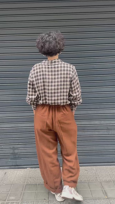 Pantalón ancho en tono teja con pinzas y vuelta en el bajo. Confeccionado en un tejido cálido de textura acanalada, suave y con cuerpo. Ideal para otoño e invierno, combina con jerséis de lana claros o camisas de algodón y botines.